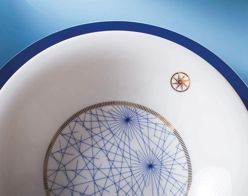 Die zwei eleganten und maritimen Dekore in Dunkelblau und Gold können nach Belieben miteinander oder dem weißen Dekor kombiniert werden. So kann der kleine Snackteller sowohl als Untersetzer als auch als Deckel für die Tassen und Schalen verwendet werden.