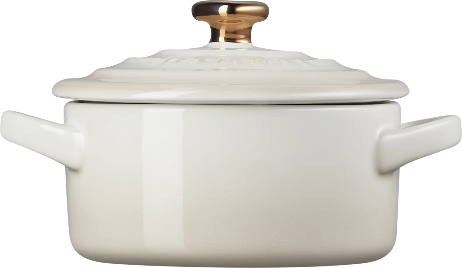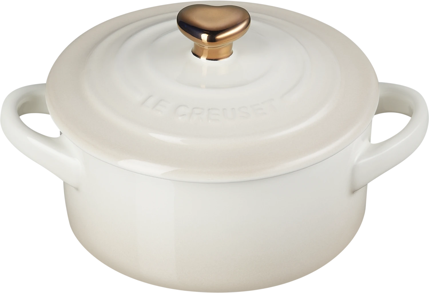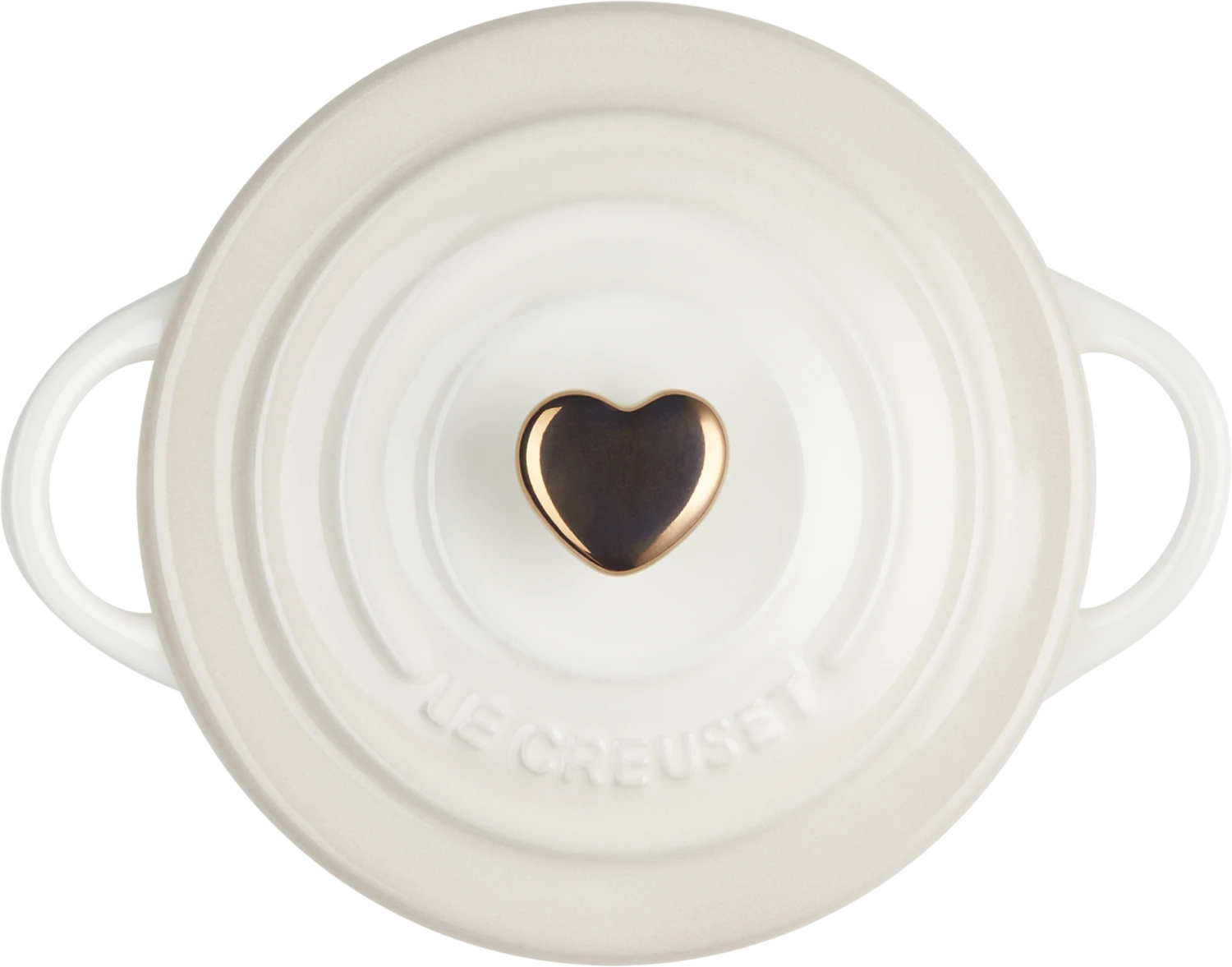 Le Creuset Mini Cocotte mit Herzknopf in meringue. Vielfältig einsetzbares Serviertöpfchen aus Steinzeug mit liebevollem, goldenem Detail im Deckelknauf.