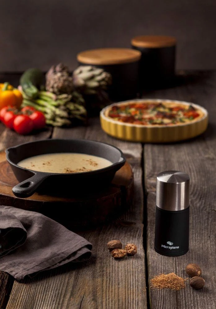Ein besonders präzises und feines Reibeergebnis und somit ein vollmundiges Aroma wird durch die langlebigen rasiermesserscharfen Edelstahlklingen erzeugt. Diese Mühle eignet sich nicht nur für Muskatnüsse, auch schwarzer Pfeffer, Zimt, Nüsse, Kräuter und diverse Getreidekörner können hiermit fein gerieben werden.