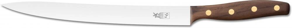 Windmühlenmesser Fleisch- und Filiermesser K6 in Walnuss (rostfrei). Ein klassischer Tranchelard mit langer, mittelspitzer Klinge ist das neueste Messer der K- Serie von Windmühlenmesser. Fein ausgeschliffen vom Ansatz bis zur Spitze eignet es sich sehr gut zum Filieren von Fleisch, zum Schneiden von Schinken und zu weiteren Schneidarbeiten an Gemüse, Pilzen oder feinen Kräutern.